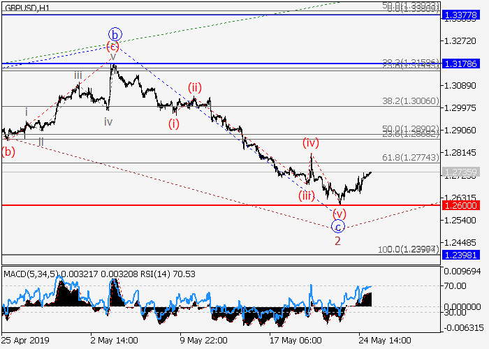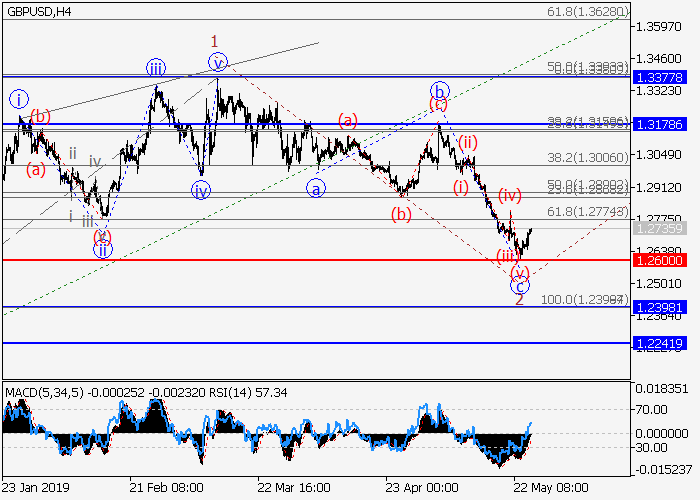 4小时图中,(3)的较高水平1的第一波已形成一个楔形,一个局部修正已发展为(3)的波2。目前,2的波c已形成,(3)的第三波3已开始发展。如果假设正确,该货币对将升至1.3178–1.3377。该情况的关键止损水平为1.2600。