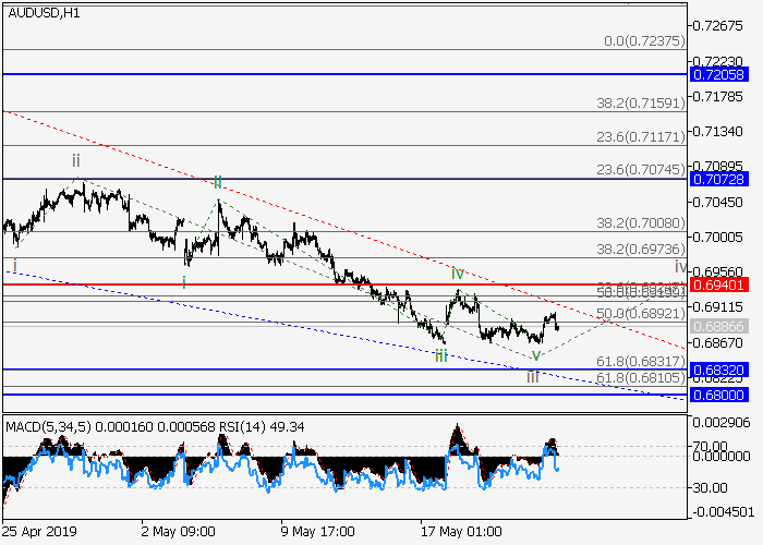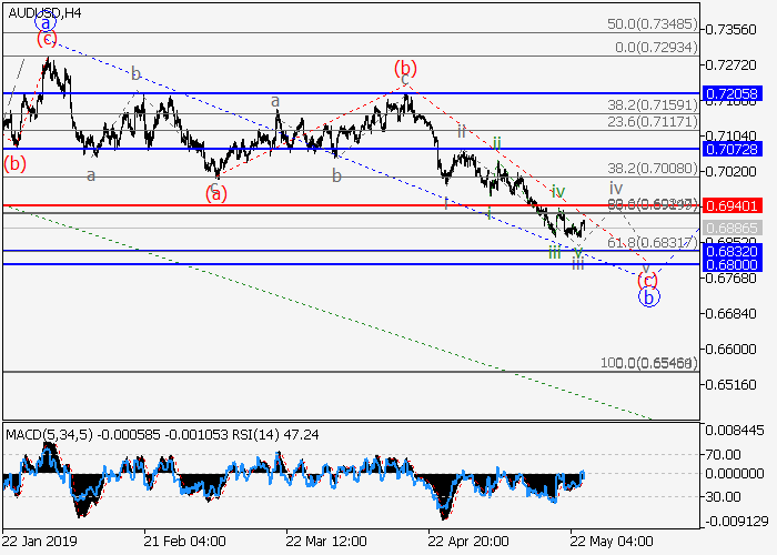 4小时图中,较高水平的上行修正发展为(5)的波2,其中,2的波b已形成。目前,b的波(c)正在发展,其中,(c)的波iii已形成。如果假设正确,在(c)的修正iv之后,该货币对将跌至0.6832–0.6800。该情况的关键止损水平为0.6940。