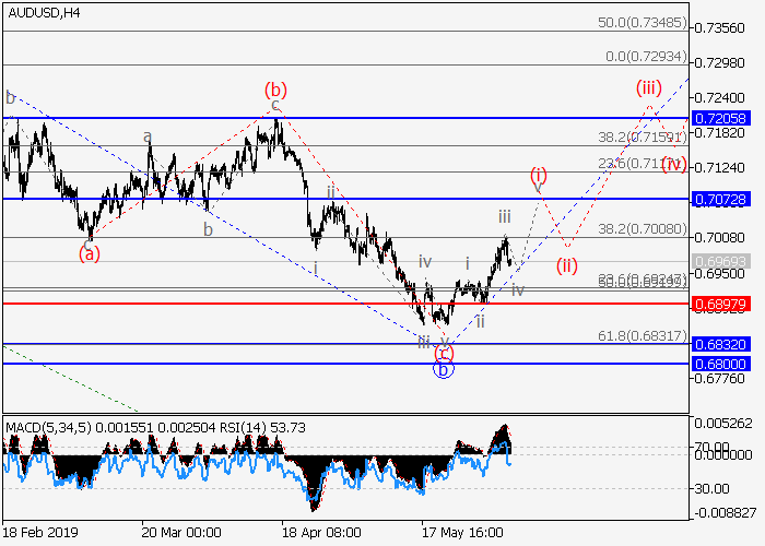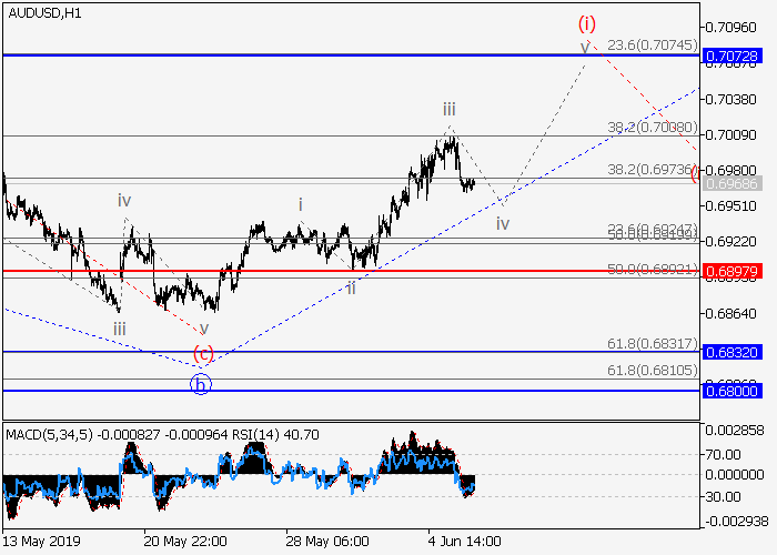 4小时图中,较高水平的下行修正已发展为2的波b。目前,2的波c正在形成,其中c的较低水平(i)的第一波正在发展。如果假设正确,价格将会升至0.7072–0.7205。该情况的关键止损水平为0.6897。