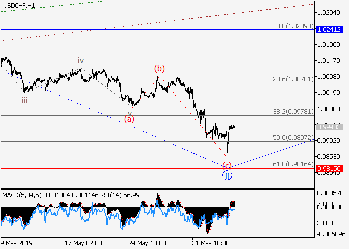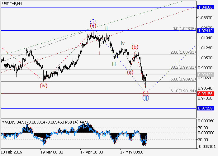 4小时图中,3的第一波i已形成,3的局部修正ii已结束。目前,较低水平的ii的波(c)已形成动量。如果假设正确,价格将会升至1.0241–1.0400。该情况的关键止损水平为0.9815。