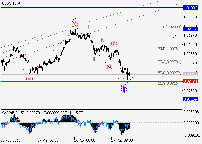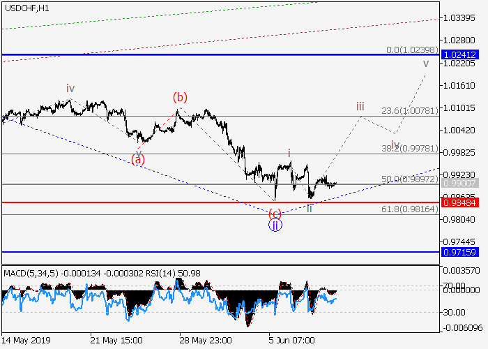 4小时图中 ,3的第一波i已形成,3的局部修正ii已结束。目前,较低水平的ii的波(c)已形成动量,3的波iii正开始发展。如果假设正确,价格将会升至1.0241–1.0400水平。该情况的关键止损水平为0.9848。