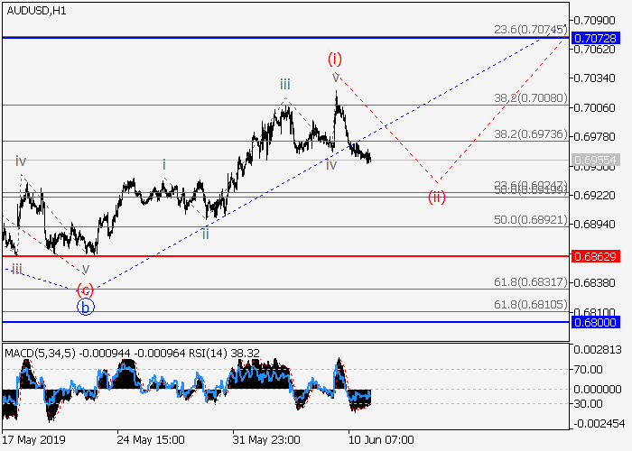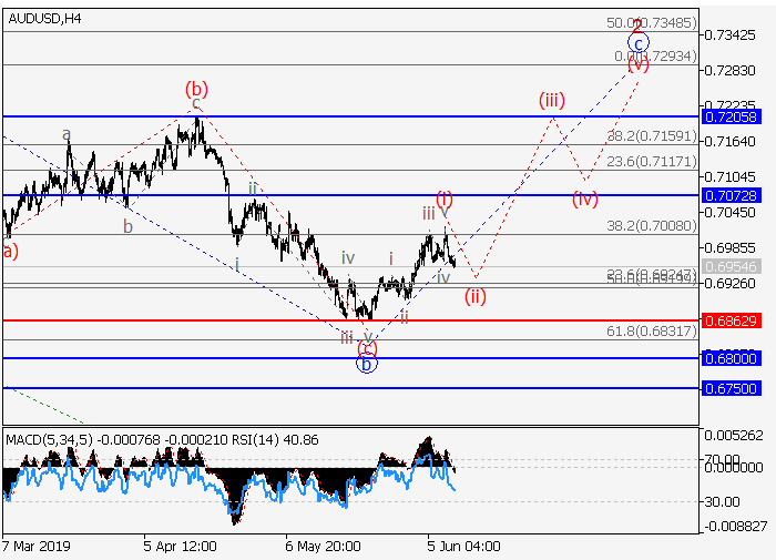 4小时途中,较高水平的下行修正已发展为2的波b。目前,2的波c正在形成,其中c的较低水平(i)的第一波已发展,c的局部修正(ii)正在形成。如果假设正确,修正结束后,价格将会升至0.7072–0.7205。该情况的关键止损水平为0.6862。
