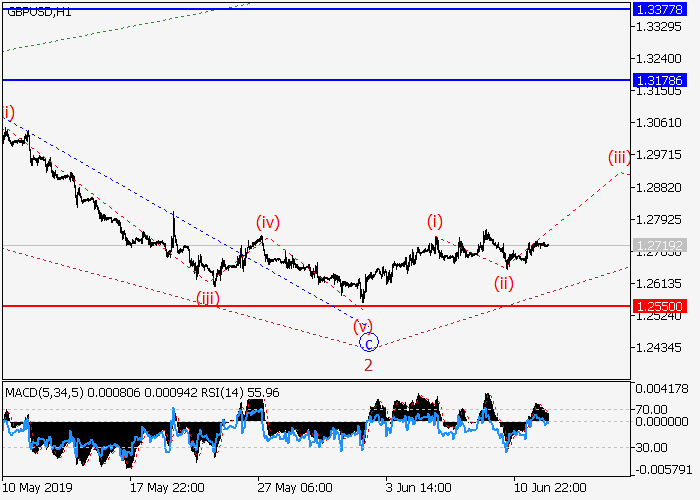 4小时图中,下行修正已发展为(3)的波2。目前,(3)的第三波3正开始发展,其中3的i的较低水平(i)的第一个入市波和其i的修正(ii)已形成。如果假设正确,价格将会升至1.3178–1.3377。该情况的关键止损水平为1.2550。