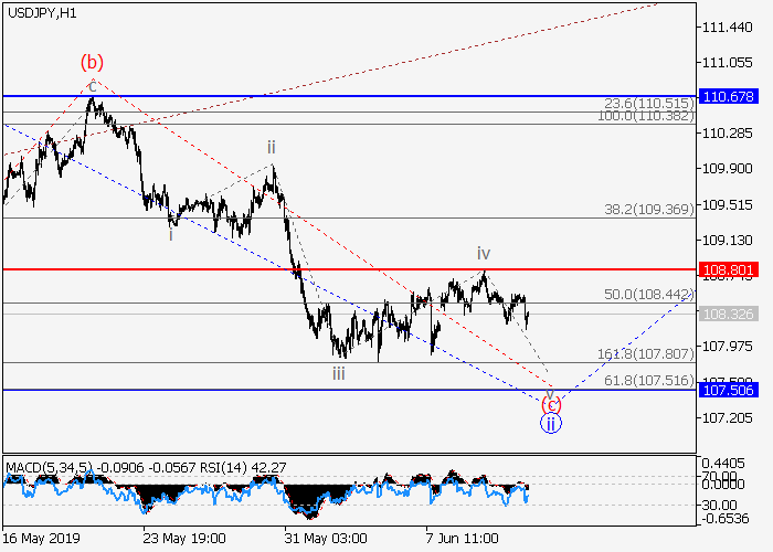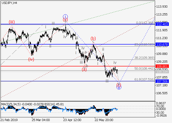 4小时图中,下行修正发展为3的波ii,呈Z字型。目前,ii的波(c)正形成动量,其中ii的(c)的结束波v正在发展。如果假设正确,价格将会跌至107.50。该情况的关键止损水平为108.80。