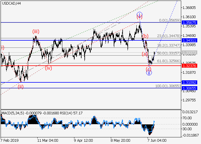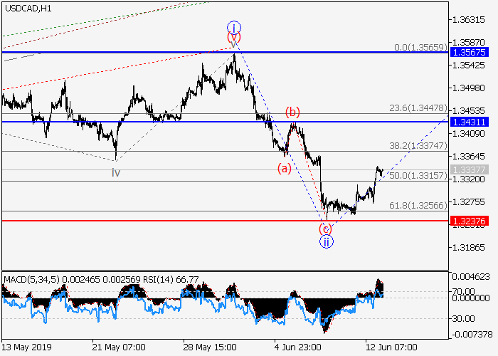 4小时图中,较高水平3的第三波在发展。目前,3的较低水平i的第一波已形成楔形,局部修正已发展为3的波ii,以达到62%水平,3的波iii正开始形成。如果假设正确,价格将会升至1.3431–1.3567。该情况的关键止损水平为1.3237。