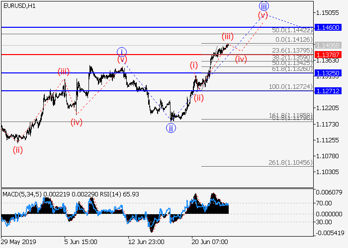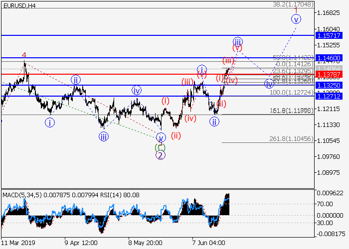 4小时图中,较高水平的下行修正已形成第二波2,第三波3开始发展。目前,3的(1)的较低水平1的第一波正在形成,其中1的波iii正在发展。如果假设正确,价格将升至1.1460–1.1571。该情况的关键止损水平为1.1378。