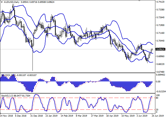 昨天,澳元兑美元汇率上涨,升至6月10日的高点。由于缺乏新的驱动因素,美元兑澳元大幅下跌,原因是紧张局势加剧,包括美伊冲突升级以及即将举行的中美元首会晤。尽管市场情绪乐观,但分析人士担心,如果特朗普和习近平6月份的谈判陷入停滞,两国贸易关系正常化近期将很难达成。周一公布的美国宏观经济数据模棱两可。5月芝加哥联邦储备银行全国经济活动指数从-0.48升至-0.05,明显好于预期(-0.37)。6月份达拉斯联邦储备银行制造业指数从-5.3点跌至-12.1点,与增长预期的4.8点相反。