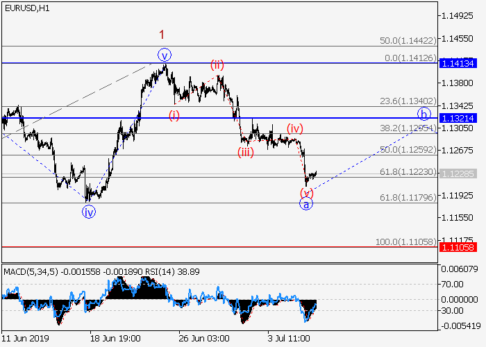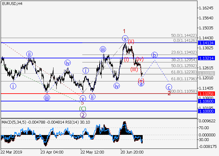 4小时图中,较高水平的下行修正形成为第二波2。目前,2的波a已形成动量。如果假设正确,短期内该货币对可能会在2的波b内升至1.1320水平。该情况的关键止损水平为1.1105