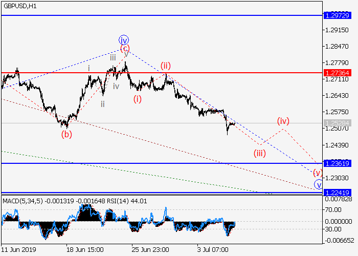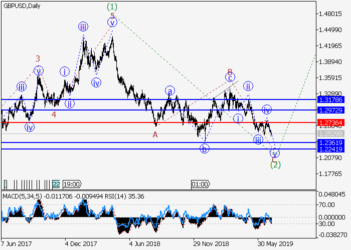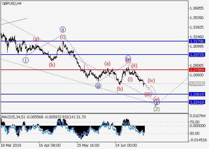 日线图中较高水平的下行修正发展为波(2),其中(2)的波C形成动量。目前,C的第五个结束波v正在形成,其中v的较低水平(iii)的第三波正在形成。如果假设正确,价格将会跌至1.2361-1.2241水平。该请客关键止损水平为1.2736。
