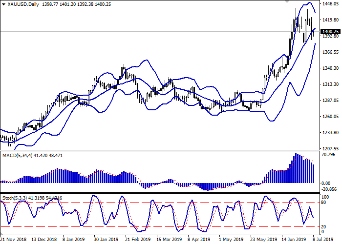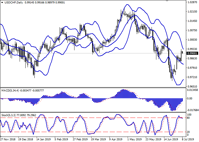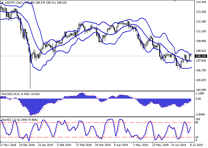日线图中,布林带呈平面动态。但价格区间正从上方扩大,未及“牛市”走势的发展。平滑异同移动平均线指数正在增长,保持适度买入信号(图柱在信号线上方)。随机指标保持稳定的上行,但正迅速接近其最大值,表明超短期内货币对超买。
