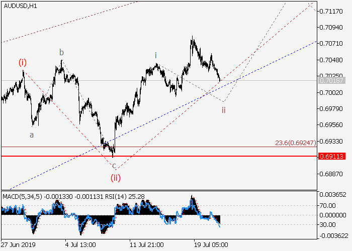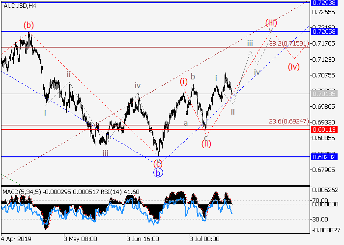 4小时图中,较高水平的修正发展为(5)的第二波2,其中2的波c已开始形成。目前,c的下行修正(ii)已结束,c的第三波(iii)已开始发展,其中(iii)的局部修正ii正发展为不规则形。如果假设正确,修正结束后,价格将会升至0.7205–0.7293。该情况的关键止损水平为0.6911。
