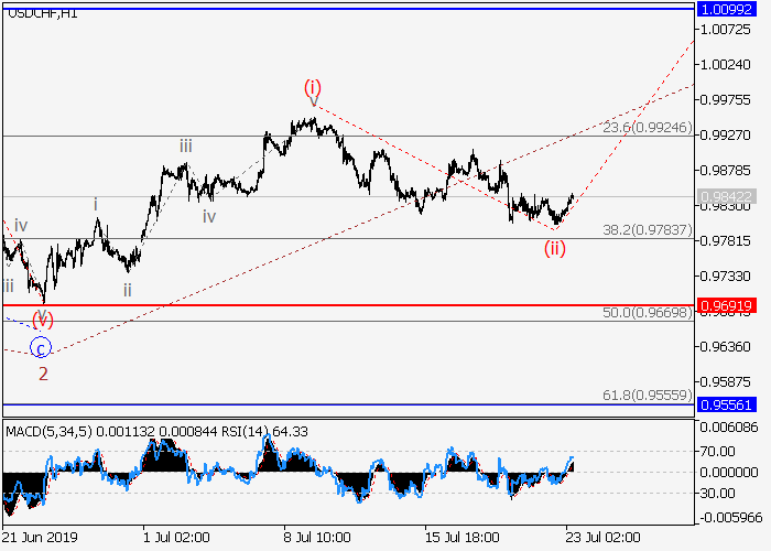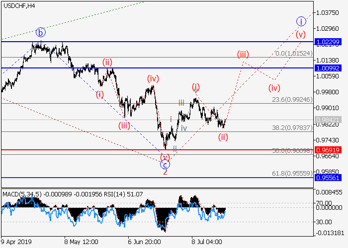 4小时图中,较高水平的下行修正发展为第二波2。目前,第三波3已开始发展,其中3的i的较低水平(i)的第一波已形成,i的修正(ii)已结束。如果假设正确,价格将会升至1.0099–1.0229。该情况的关键止损水平为0.9691。
