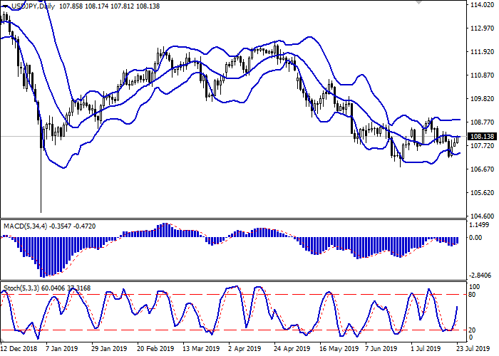 日线图中,布林带显示了平面动态。价格范围由下略缩小, 反映了短期内交易方向变化。平滑异同移动平均线指数正在增长,保持弱买入信号(图柱在信号线上方)。随机指标显示增长更为稳定,但正迅速接近其最大值,表明超短期内超买美元的风险正在上升。