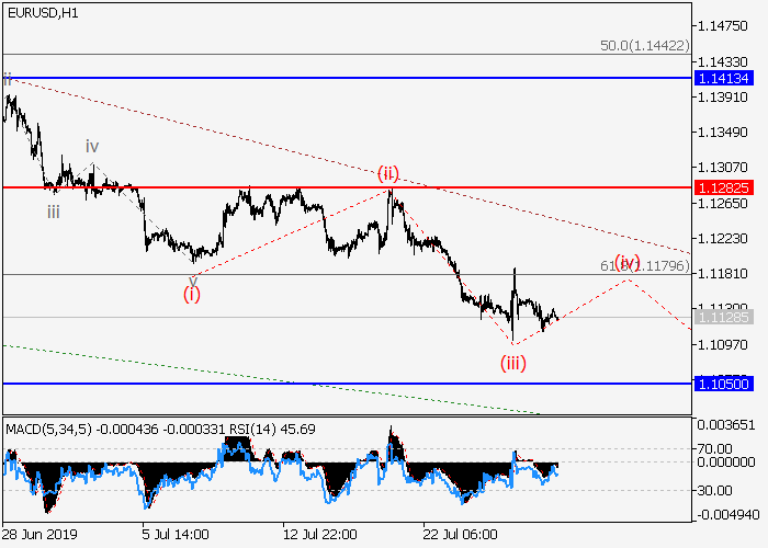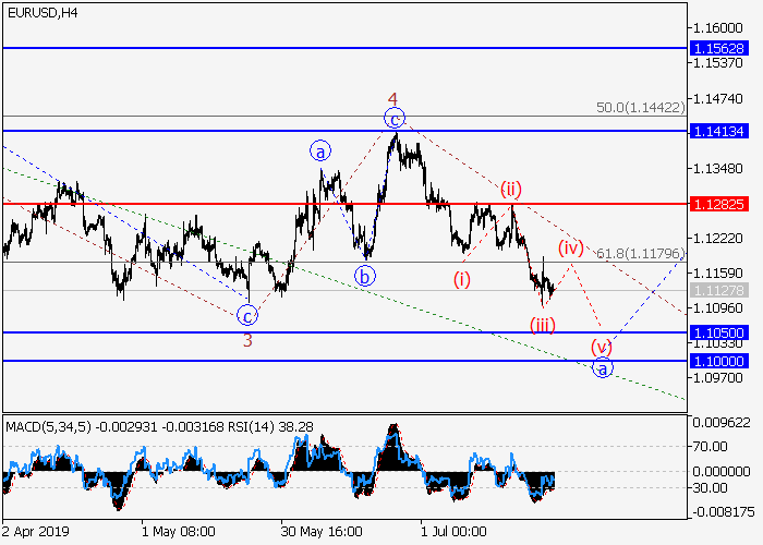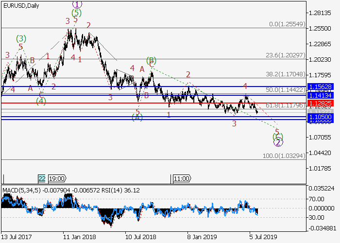 日线图中,较高水平的下行修正发展为波2,其中2的波(C)d在形成。目前,(C)的第五波5正在形成,其中5的波a正在形成。如果假设正确,价格将会跌至1.1050–1.1000水平。该情况的关键止损水平为1.1282