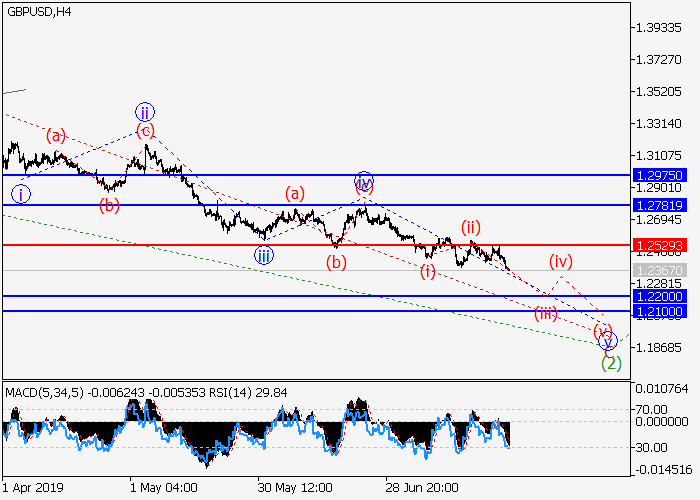 日线图中,较高水平的下行修正发展为波(2),其中(2)的波C形成。目前,C的第五波v正在发展,其中,v的较低水平(iii)的第三波正在形成,如果假设正确,价格将会跌至1.2200-1.2100水平。该请客关键止损水平为1.2529水平