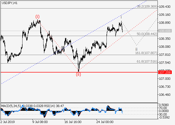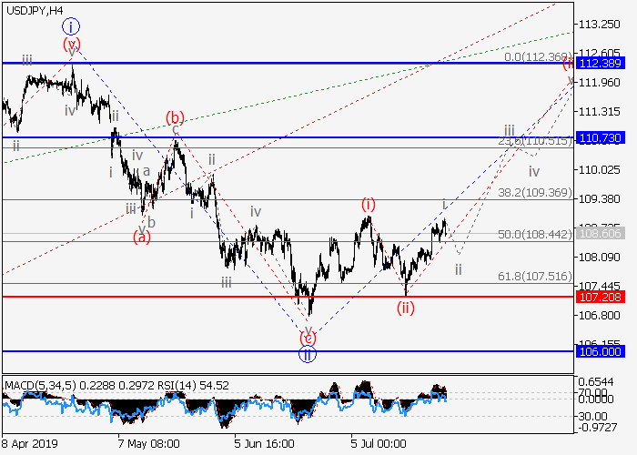 4小时图中,较高水平的下行修正已发展为3的波ii,呈Z字型。目前,3的第三波iii已开始,其中iii的较低水平(ii)修正已结束,iii的波(iii)一开始发展。如果假设正确,价格将会升至110.73–112.38。该情况的关键止损水平为107.20