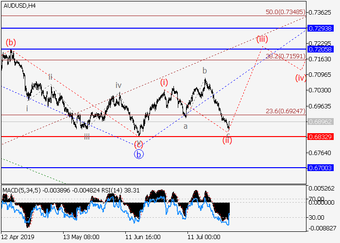 4小时图中,较高水平的修正发展为(5)的第二波2,其中2的波c已开始形成。目前,c的较低水平(i)的第一波已形成,c的较低水平(ii)已发展为不规则平面。如果假设正确,价格将会升至0.7205–0.7293。该情况的关键止损水平为0.6832