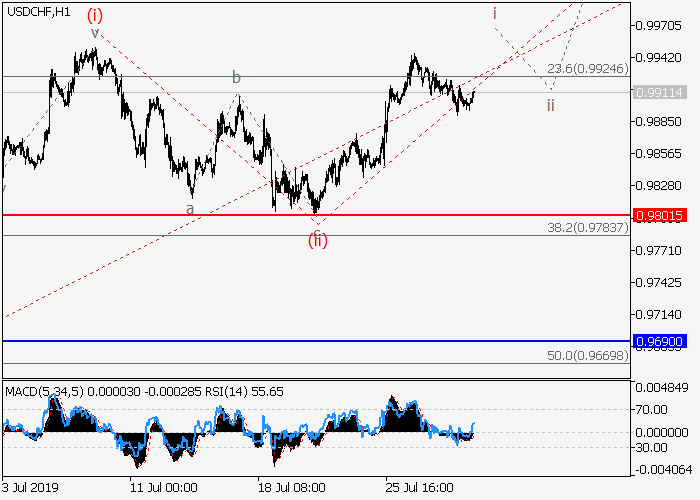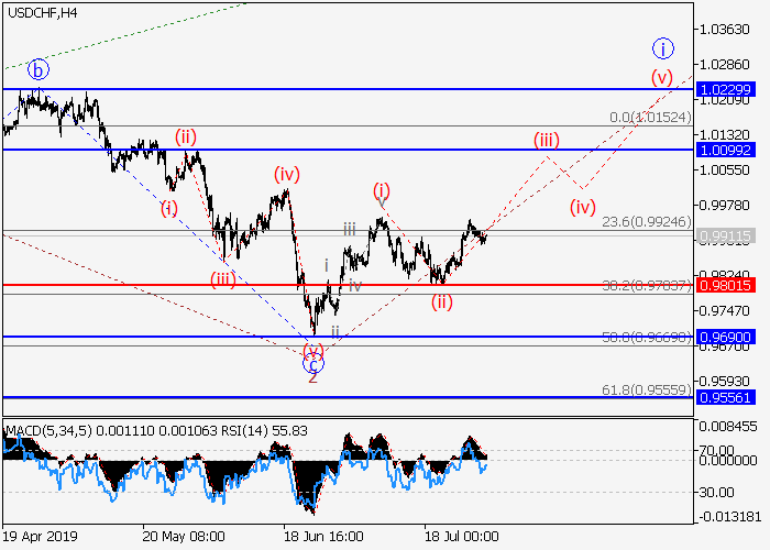 4小时图中,较高水平的下行修正已发展为第二波2。目前,第三波3已开始发展,其中修正已结束为较低水平的i的波(ii),i的波(iii)已开始。如果假设正确,价格将会升至1.0099–1.0229。该情况的关键止损水平为0.9801