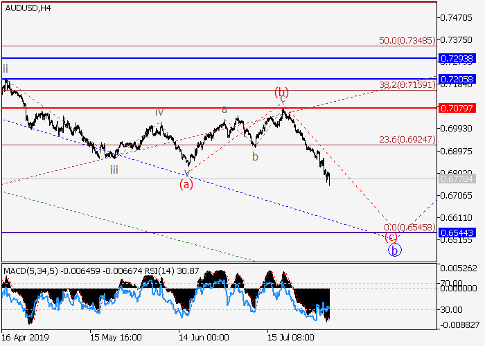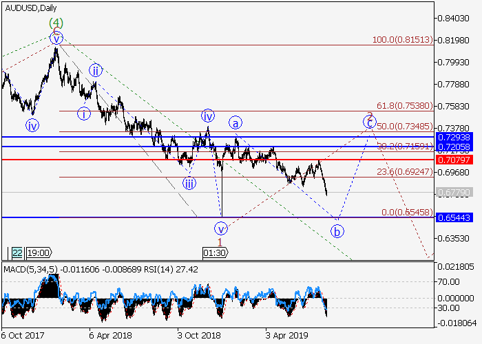日线图中,较高水平的修正发展为(5)的第二波2,其中2的波b形成。目前,较低水平的c的波(b)已发展,c的波(c)正在形成。如果假设正确,价格将会跌至0.6544。该情况关键止损水平为0.7079