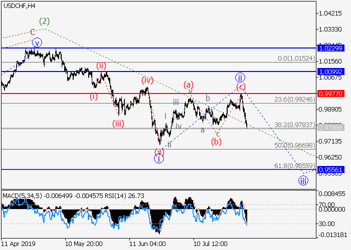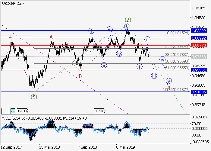 日线图中,较高水平的上行修正发展为第二波(2)。目前,第三波(3)已开始发展,其中(3)的第一波1正在发展。如果假设正确,价格将会跌至0.9556–0.9188水平。该情况的关键止损水平为0.9977