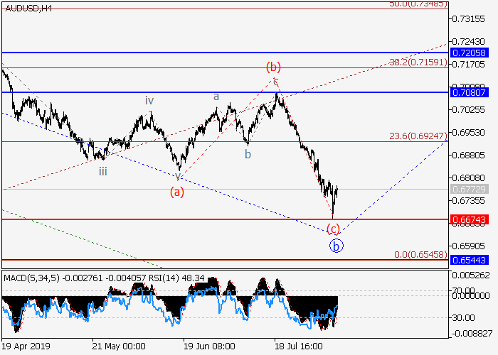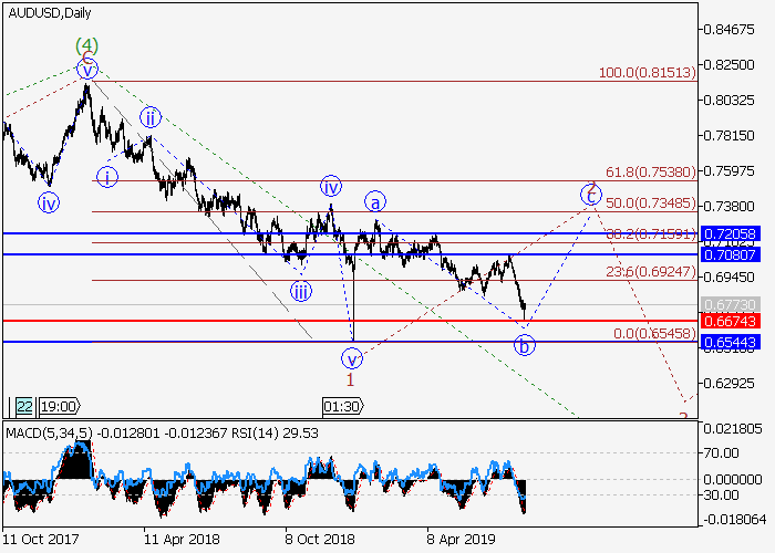 日线图中,较高水平的修正发展为(5)的第二波2,其中2的波b已形成。目前,b的波(c)已发展。如果假设正确,价格将会升至0.7080–0.7205水平。该情况的关键止损水平为0.6674