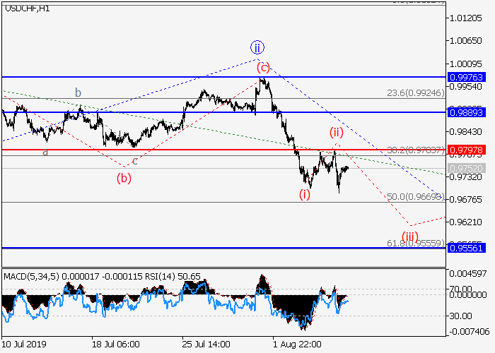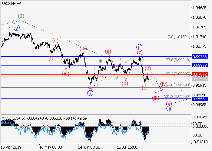 4小时图中,较高水平(3)的第三波在发展。目前,(3)的1的较低水平iii的第三波已开始发展。其中iii的波(i)已形成,iii的修正(ii)已结束。如果假设正确,价格将会跌至0.9556–0.9188。该情况的关键止损水平为0.9797