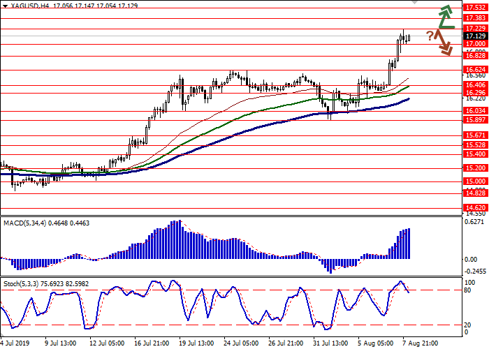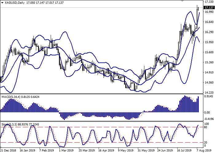 昨天,银价稳步上涨,刷新了2018年6月以来的低点。在美中贸易关系不断恶化之际,投资者对风险的兴趣急剧下降,这可能导致全球经济出现新的放缓,为该交易工具提供了支持。此外,世界主要中央银行为刺激经济和降低利率而采取的行动也对交易工具产生了积极影响。周三由于全球经济前景恶化,新西兰央行将利率下调了50个基点。