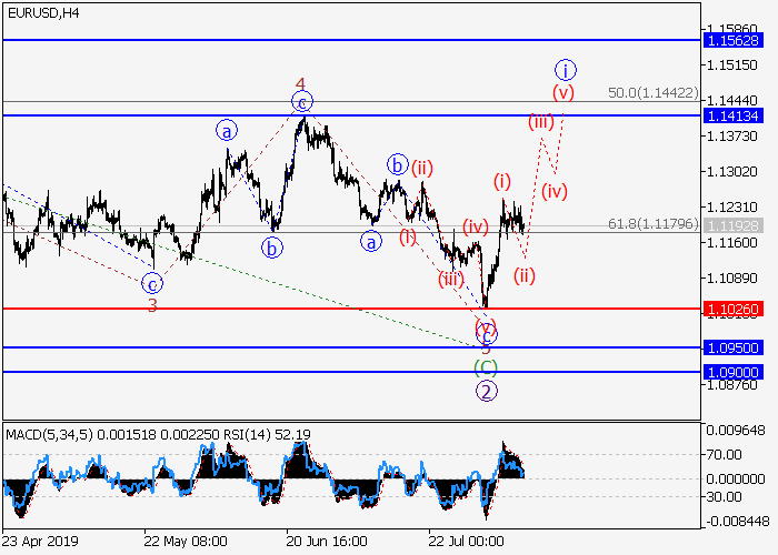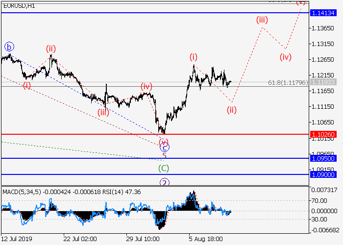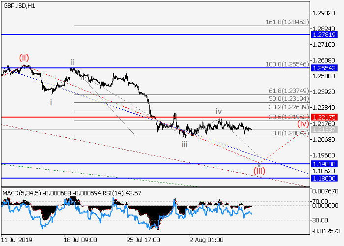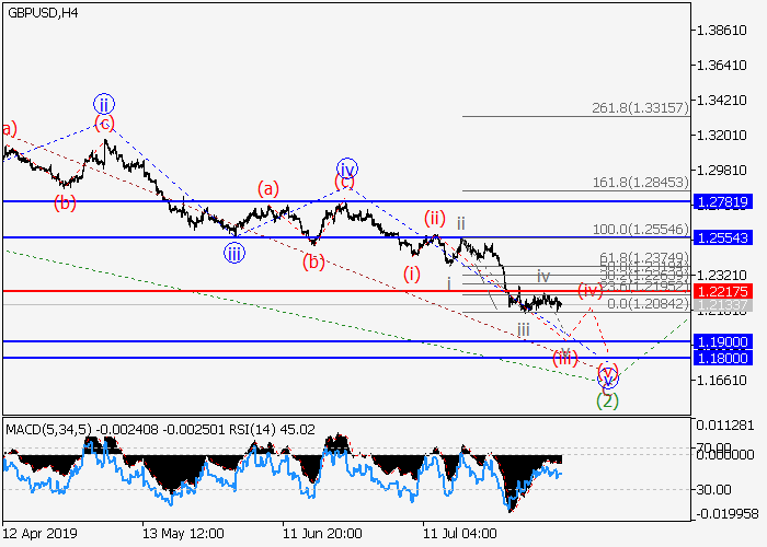 4小时图中,较高水平的下行修正发展为波(2),其中(2)的波C形成。目前,C的第五波v正在发展,其中v的较低水平(iii)的第三波正在形成。如果假设正确,价格将会升至1.1900–1.1800。该情况的关键止损水平为1.2217。