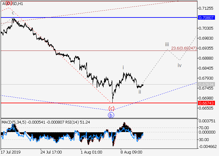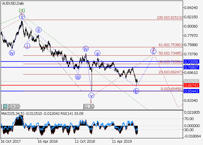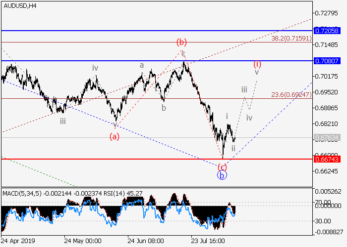 日线图中,较高水平的修正发展为(5)的第二波2,其中,2的波b已形成。目前,2的波c正开始发展,其中c的(i)的较低水平i的第一个入市波已形成。如果假设正确,价格将会升至0.7080–0.7205水平。该情况的关键止损水平为0.6674