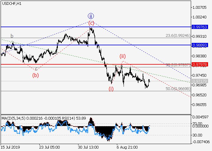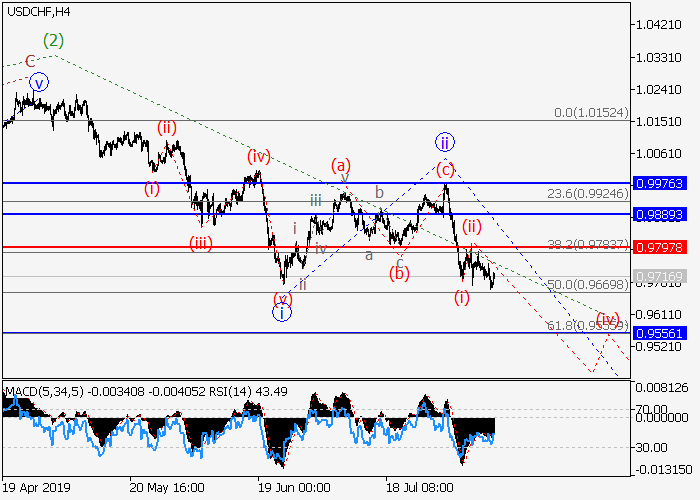 4小时图中,较高水平(3)的第三波在发展。目前,(3)的1的较低水平iii的第三波已开始发展,其中iii的波(i)已形成,iii的修正(ii)已结束。如果假设正确,价格将会跌至0.9556–0.9188水平。该情况的关键止损水平为0.9797。