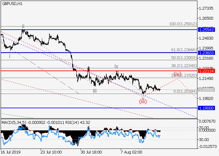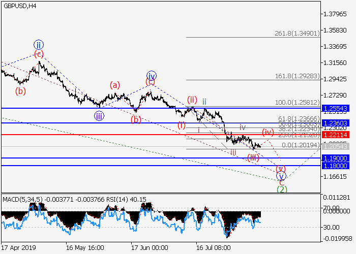 4小时图中,较高水平的下行修正发展为波(2),其中(2)的波C形成。目前,C的第五波v正在发展,其中,v的较低水平(iii)的第三波已形成,v的局部修正(iv)正在发展。如果假设正确,修正结束后,该货币对将跌至1.1900–1.1800。该情况的关键止损水平为1.2211。