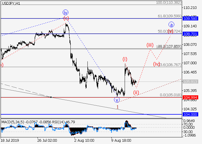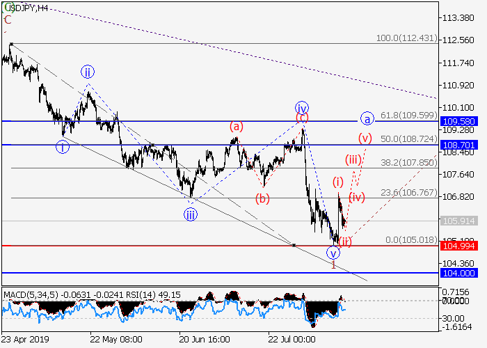 4小时图中,较高水平的波C在发展,其中第一波1已形成扩大对角线。目前,上行修正正开始形成为波2,其中2的波a正在发展。如果假设正确,价格将会升至108.70–109.58水平。该情况的关键止损水平为104.99.
