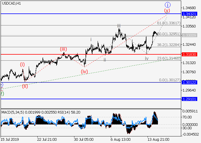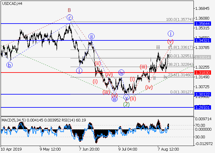 4小时图中,较高水平的下行修正已发展为波(2),波(3)已开始形成。目前,(3)的1的较低水平i的第一波正在形成,其中,i的第五波(v)正在发展。如果假设正确,价格将会升至1.3432–1.3564水平。该情况的关键止损水平为1.3183。