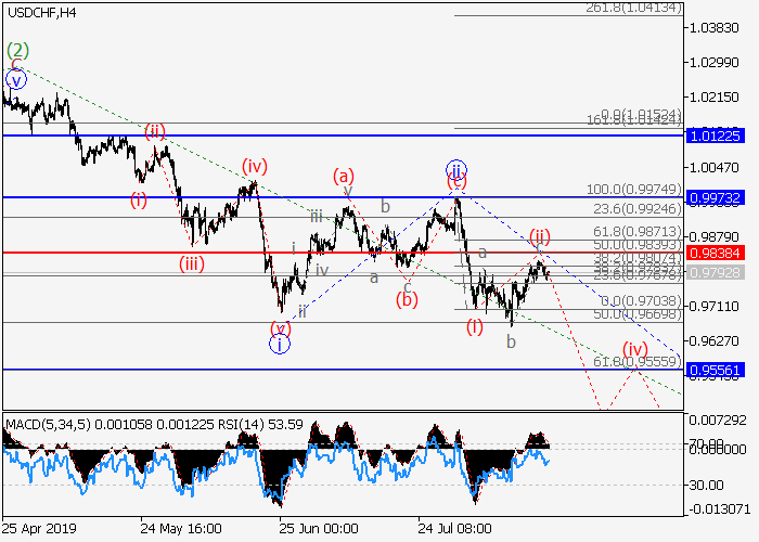4小时图中,(3)的3的较高水平iii的第三波在发展,其中iii的第一波(i)已形成。目前,上行修正已发展为iii的波(ii),呈不规则平面。如果假设正确,价格将会跌至0.9556水平以下。该情况的关键止损水平为0.9838。