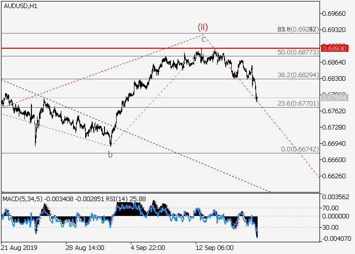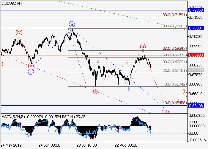 日线图中,(5)的较高水平3的第三波形成,其中3的波iii在发展。目前,上行修正已形成为iii的波(ii),iii的波(iii)已开始发展。如果假设正确,价格将会跌至0.6540–0.6418水平。该情况的关键止损水平为0.6893