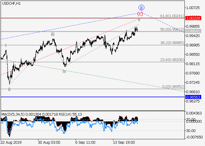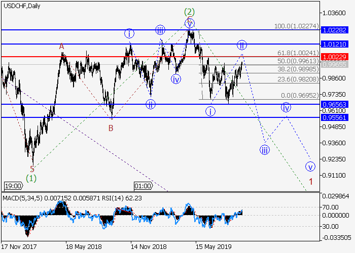 日线图中,较高水平(3)的第三波已开始发展,其中(3)的第一波1形成,局部修正已发展为1的波ii,呈不规则平面,其中,ii的波(c)已形成。如果假设正确,价格将会在1的波iii内跌至0.9656–0.9556水平。该情况的关键止损水平为1.0022。