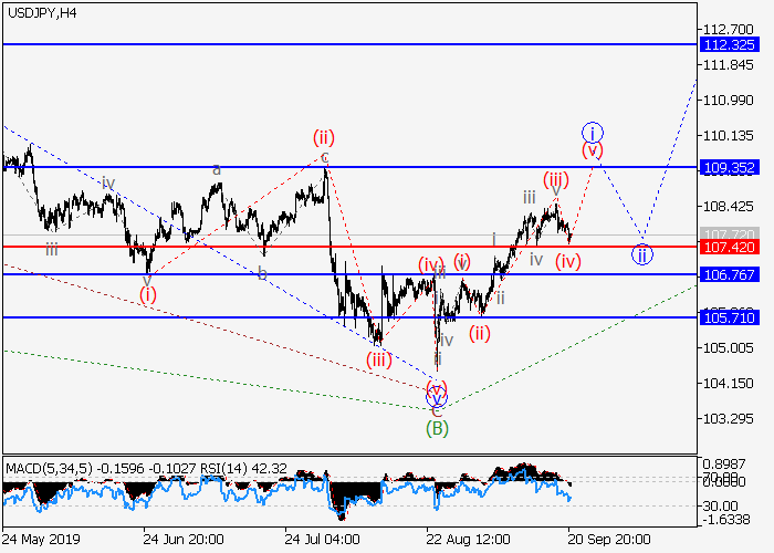 4小时图中,1的第一波i在较高水平的起始波(C)中发展。目前,1的i的较低水平(iii)的第三波已形成,i的局部修正(iv)正在结束。如果假设正确,价格将会升至109.35–112.32。该情况的关键止损水平为107.42。