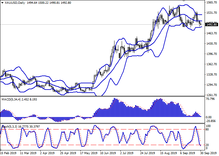 日线图上,布林带呈平面动态。价格区间从下方略微收窄,反映出交易的不确定性。平滑异同移动平均线指数下降,保持强卖出信号(图柱位于信号线下),并即将打破零线。然而,随机指数正在下降,正迅速接近其低点,这表明黄金可能在非常短的时间内出现超卖。