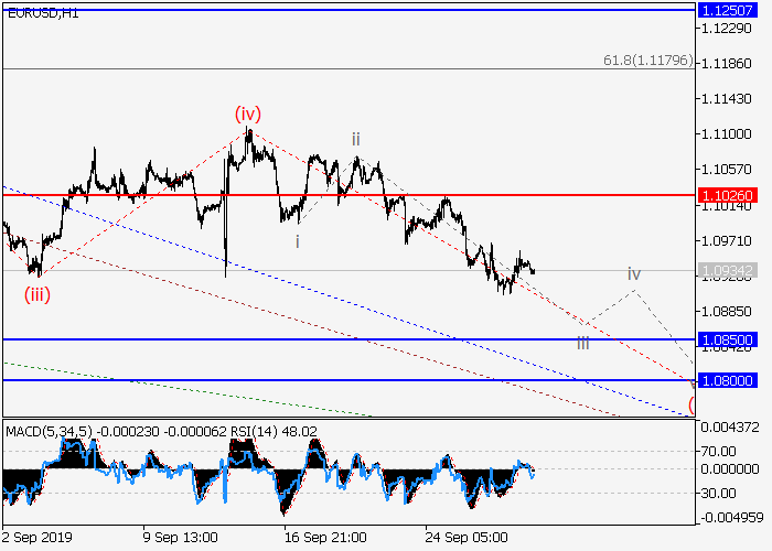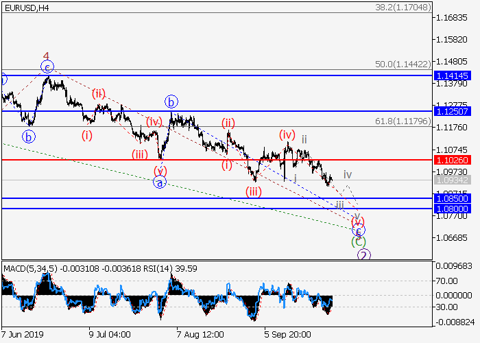4小时图中,较高水平的下行修正发展为波2,其中2的(C)的第五波形成。目前,较低水平的5的波c正在发展,其中c的波(v)正在形成。如果假设正确,价格将会跌至1.0850–1.0800水平。该情况的关键止损水平为1.1026.