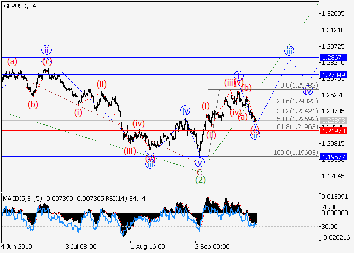 4小时图中,较高水平的下行修正已发展为波(2)的,(2)的波C已结束。目前,较高水平的第三波已开始形成,其中,(3)的1的较低水平i的第一波已形成,下行修正作为1的波ii正在结束发展。如果假设正确,修正结束后,价格将会升至1.2704–1.2867水平。该情况的关键止损水平为1.2197。