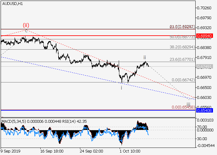 4小时图中,(5)的3的较高水平iii的第三波形成,其中3的iii的波(iii)在发展。目前,(iii)的较低水平i的已形成,(iii)的局部修正ii已结束。如果假设正确,价格将会跌至0.6540–0.6418水平。该情况的关键止损水平为0.6894。