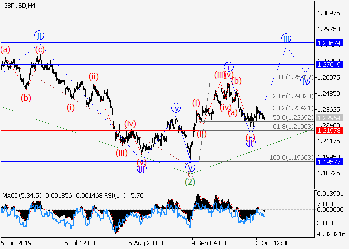 4小时图中,较高水平的下行修正已发展为波(2),其中(2)的波C已结束。目前,较高水平的第三波已开始,其中(3)的1的较低水平i的第一波已形成,下行修正已发展为1的波ii,以达到修正水平62%。如果假设正确,价格将会升至1.2704–1.2867水平。该情况的关键止损水平为1.2197。
