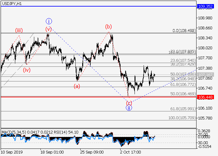 4小时图中,第一波1在已开始的较高水平的波(C)中发展。目前,(C)的1的较低水平i的第一波已形成,1的局部修正ii已结束,已达到50%修正水平。如果假设正确,价格将会升至109.35–112.32水平。该情况的关键止损水平为106.44。