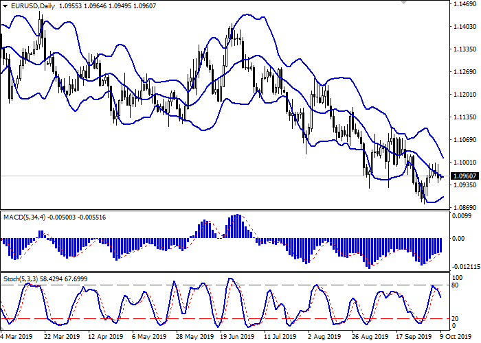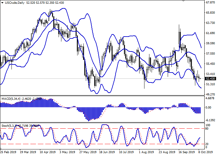 日线图中,布林带呈稳定下降趋势。价格区间正由下小幅收窄,这是对超短期内出现不明确动态的反应。平滑异同移动平均线下跌,保持弱卖出信号(位于信号线下)。随机指标正在增长,对本周初出现的交易下跌性质几乎没有反应。