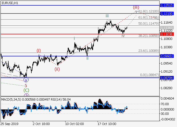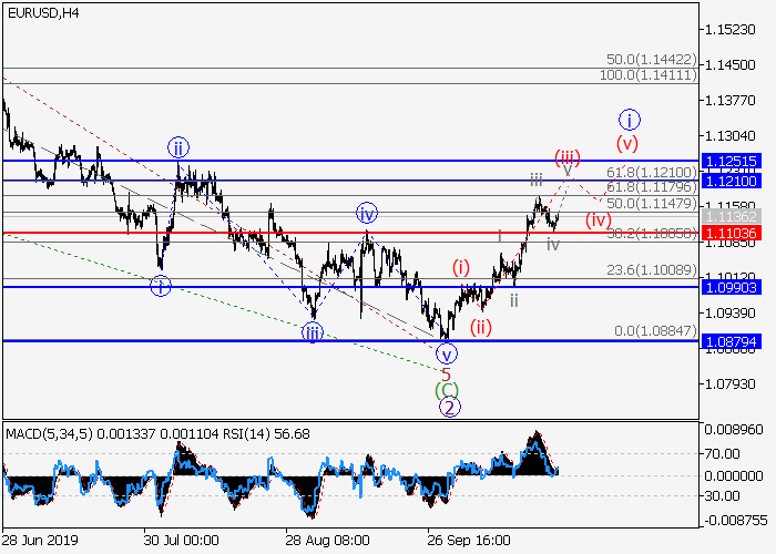 4小时图中,较高水平的下行修正已发展为波2,其中2的(C)的第五波5已形成。目前,3的(1)的1的较低水平i的第一波正在发展,其中i的波(iii)正在形成。如果假设正确,价格将会升至1.1210–1.1251。该情况的关键止损水平为1.1103。