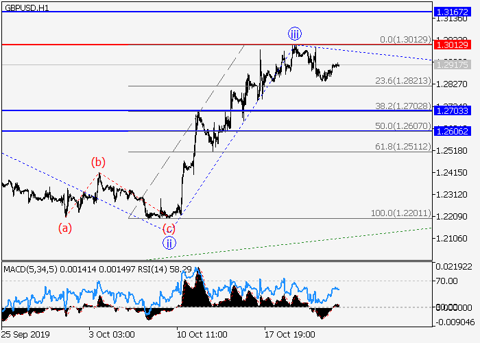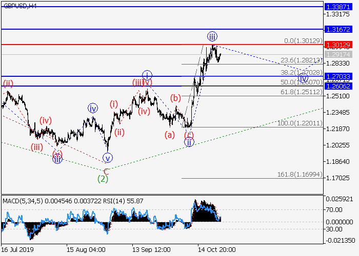 4小时图中,较高水平的下行修正已发展为波(2),第三波(3)已开始形成。目前,(3)的第一波1正在形成,其中1的较低水平iii的第三波已形成,下行修正正发展为1的波iv。如果假设正确,价格将会跌至1.2703–1.2606。该情况的关键止损水平为 1.3012。