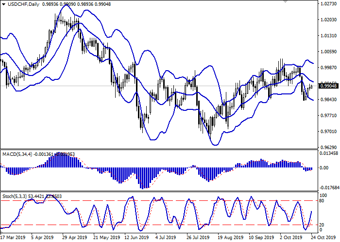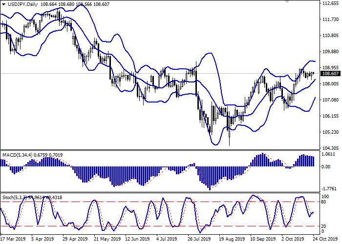 日线图中,布林带呈活跃增长。价格区间正在收窄,反映出短期内交易的不确定性。平滑异同移动平均线下跌,保持弱卖出信号(位于信号线下)。随机指数中断了积极下跌趋势,上行逆转,对周三美元走强作出反应。