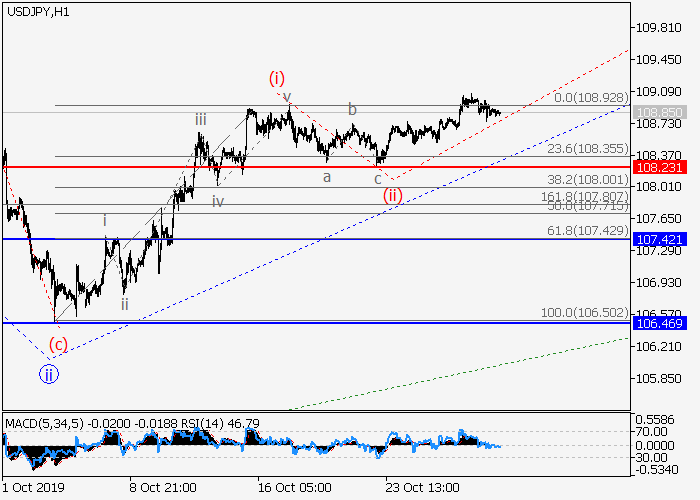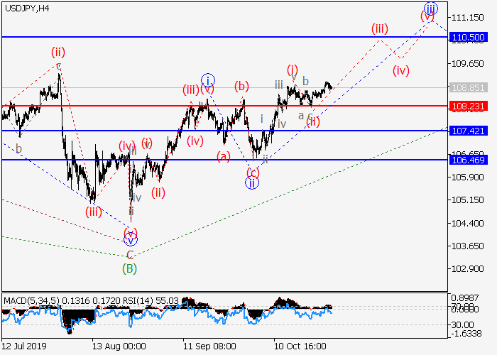 4小时图中,第三波iii在(C)的较高水平1的第一波中发展。目前,1的iii的较低水平(i)的第一波已形成,局部修正已结束为iii的波(ii)。如果假设正确,价格将会升至110.50。该情况的关键止损水平为108.23。