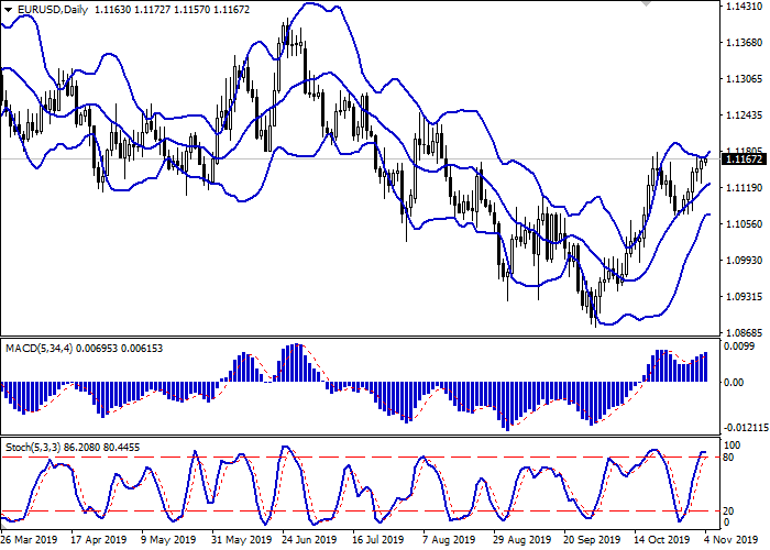 日线图中布林带活跃增长。价格区间积极扩大,为看多趋势开辟了一条前往局部新高的通道。平滑异同移动平均线指标正在增长,保持稳定的买入信号(位于信号线上方)。随机指标在接近高点后,向水平方向反转,表明欧元在超短期内超买。