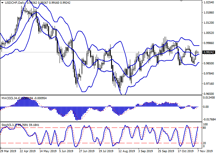 日线图上,布林带移动平缓。价格范围在与当前观察到的市场动态相一致的狭窄边界内盘整。平滑异同移动平均线指标下降,保持弱卖出信号(图柱低于信号线),并试图在零线以下盘整。随机指数正在下降,并迅速接近20水平,该水平为超短期内超卖区的正式边界。